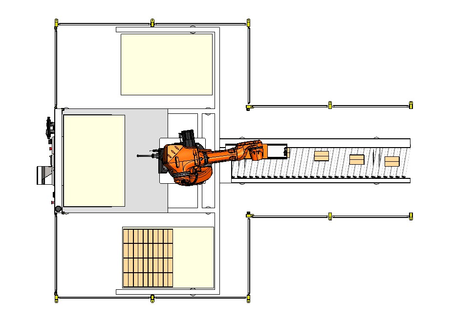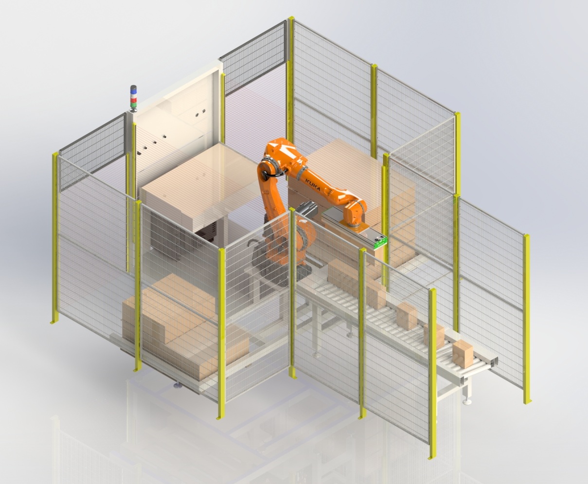 A PAL - 007 é uma célula robotizada concebida para paletizar automaticamente caixas, sacas ou garrafões. Requer apenas um operador (não dedicado) para substituição de paletes. As caixas são entregues ao robô por um transportador de rolos. O robô realiza a paletização em duas docas de carga independentes, permitindo uma operação de paletização contínua. A célula integra barreiras de segurança fotoelétricas, garantindo a proteção do operador. O padrão de paletização é configurável via HMI, com possibilidade de inclusão de intercalares de cartão entre as várias camadas de paletização.