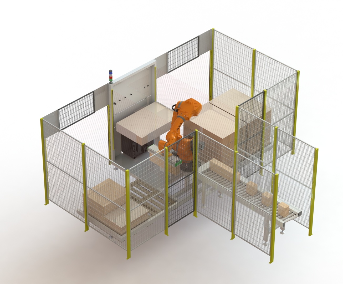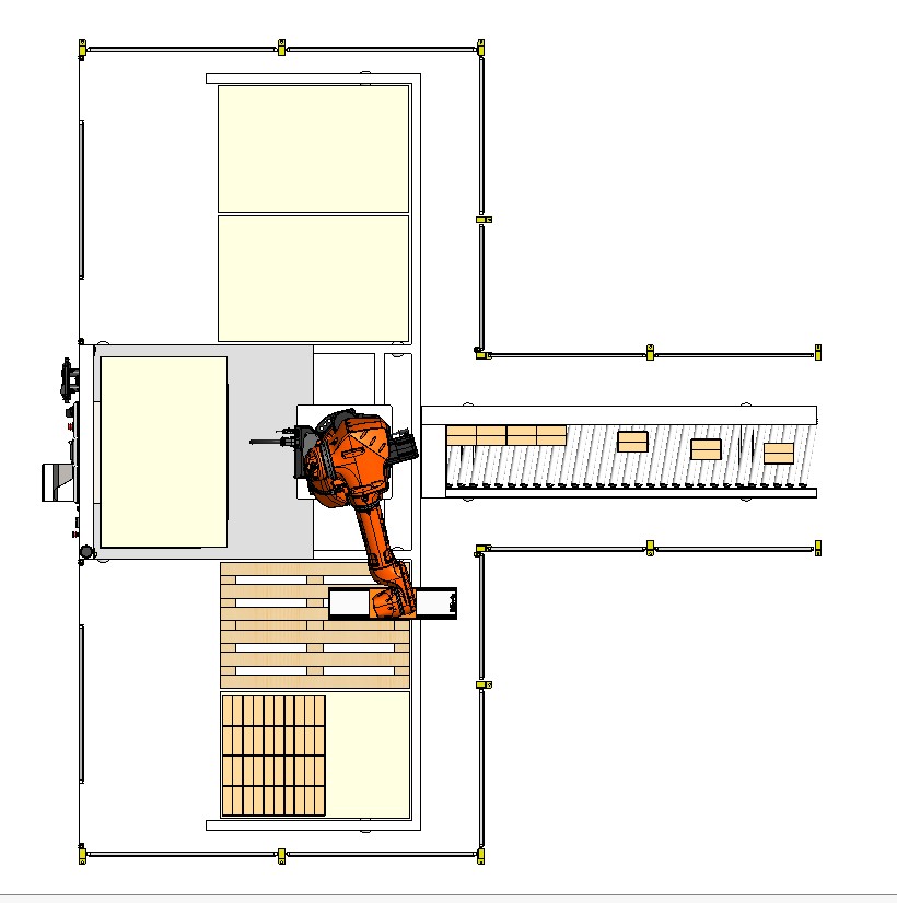 A PAL - 010 é uma célula robotizada concebida para paletizar automaticamente caixas, sacas ou garrafões. Requer apenas um operador (não dedicado) para substituição de paletes. As embalagens são entregues ao robô por um transportador de rolos. O robô realiza a paletização em duas docas duplas de carga independentes, permitindo uma operação de paletização contínua e de autonomia alargada. A célula integra barreiras de segurança fotoelétricas, garantindo a proteção do operador. O padrão de paletização é configurável via HMI, com possibilidade de inclusão de intercalares de cartão entre as várias camadas de paletização.